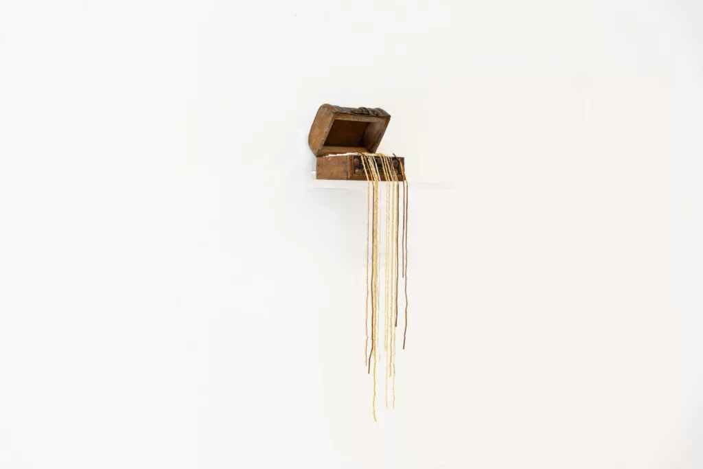 In conversations about transmission, the dialogue invariably returns to a wardrobe, a box, a coffret—places in which these women safeguard their precious creations or treasured fabrics. This gesture, the image itself, and even the scent that rises when such containers are opened, is nearly ubiquitous: it calls to mind an elder beloved figure, the keeper of a familiar armoire or box, imprinted indelibly in our visual memory. Bachelard remarks on the unfathomable intimacy of wardrobes as the “veritable organs of the secret psychological life…Like us, through us and for us, they have a quality of intimacy”. He adds, “a wardrobe’s inner space is also intimate space, space that is not open to just anybody”, a statement that reflects these women’s cautiousness in sharing their craft beyond trusted circles.[1] To miniaturize is to fold into intimate recesses, and in this exhibition, Ben Aissa does so deliberately, placing it under the magnifying glass of our gaze. This interplay of scale—the infinitesimal folds containing vast margins of primordial histories—bears intimacy and secrecy. A territory of protection, one where dreams are navigated by an effort to overcome one’s condition. At the sight of it, we sense its familiarity, and we gravitate from afar to “the mute tumult of memories”.[2]