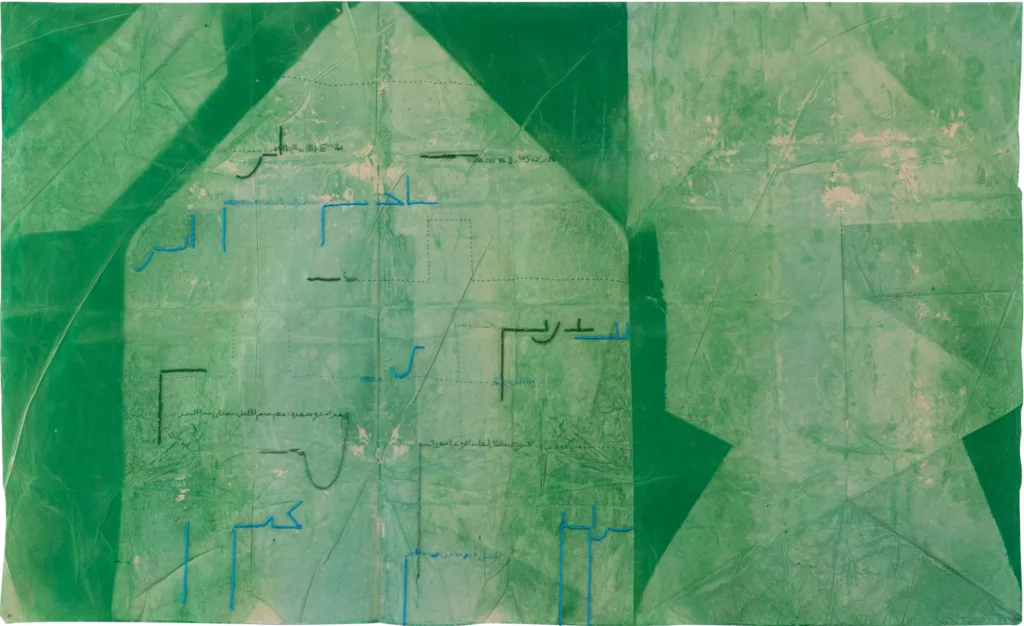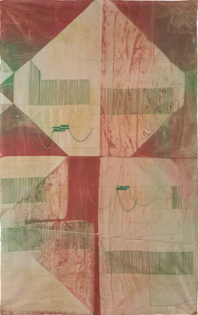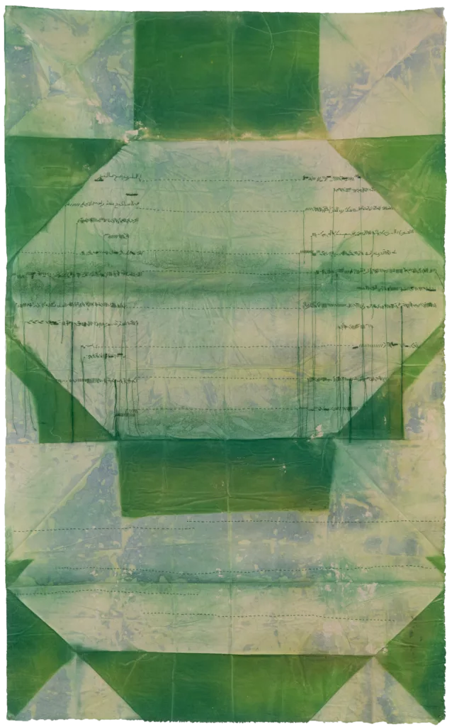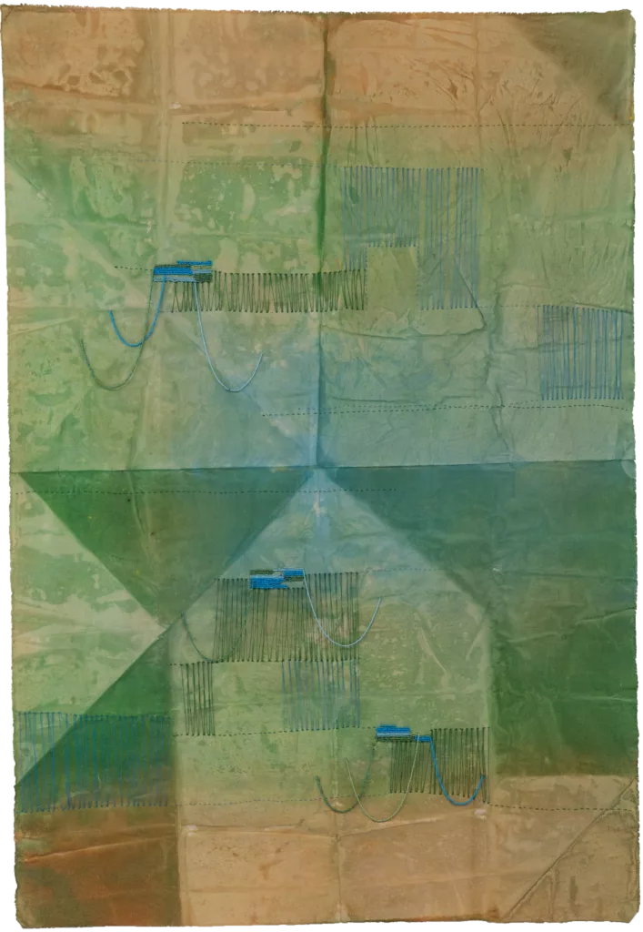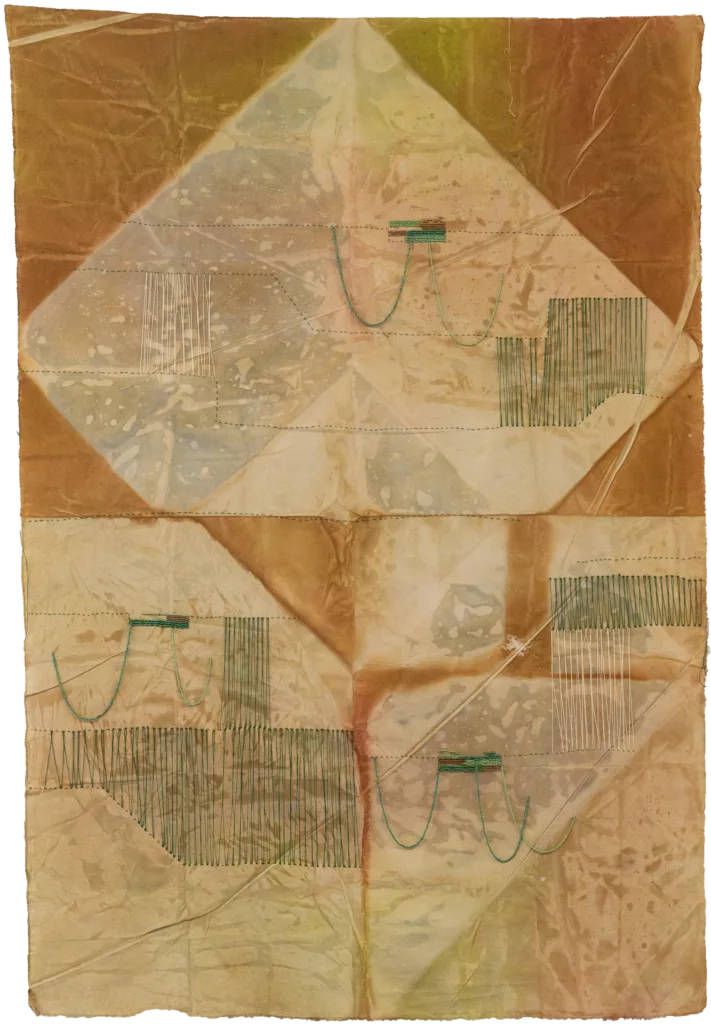 Through embroidered patterns, the thread breeds an illegible text or manuscript, translating an inner, fragmentary, and intimate memory. It is a second construction layered upon the first, built through folds, tonal shifts, contrasts, and colour. The infinite folding allows certain layers to be more porous than their superimposed counterparts: this technique or modulation allows colours to invariably unfurl and froth upon the surface, cascading and filtering through it. Just as the sun rubs on the fabric, light is absorbed, and a harmonious degradation is established, imbued within the final unfolding. The traces they bear and retain hover between appearance and disappearance, like the landscapes and stories that are doomed to vanish, and that Ben Aissa seeks to recover.